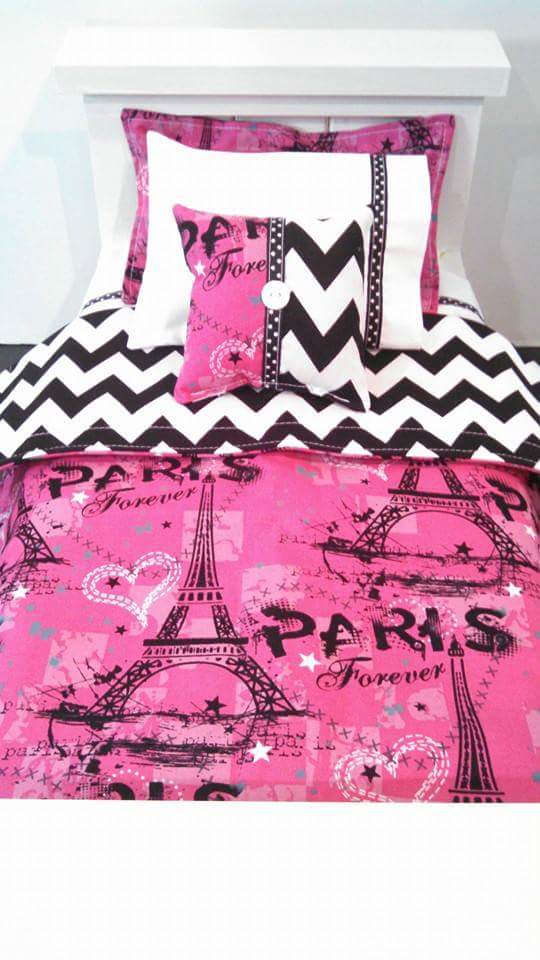 5 piece Paris doll bedding made to fit 18" doll beds. Features a cotton Paris print fabric backed by a white and black chevron print fabric.