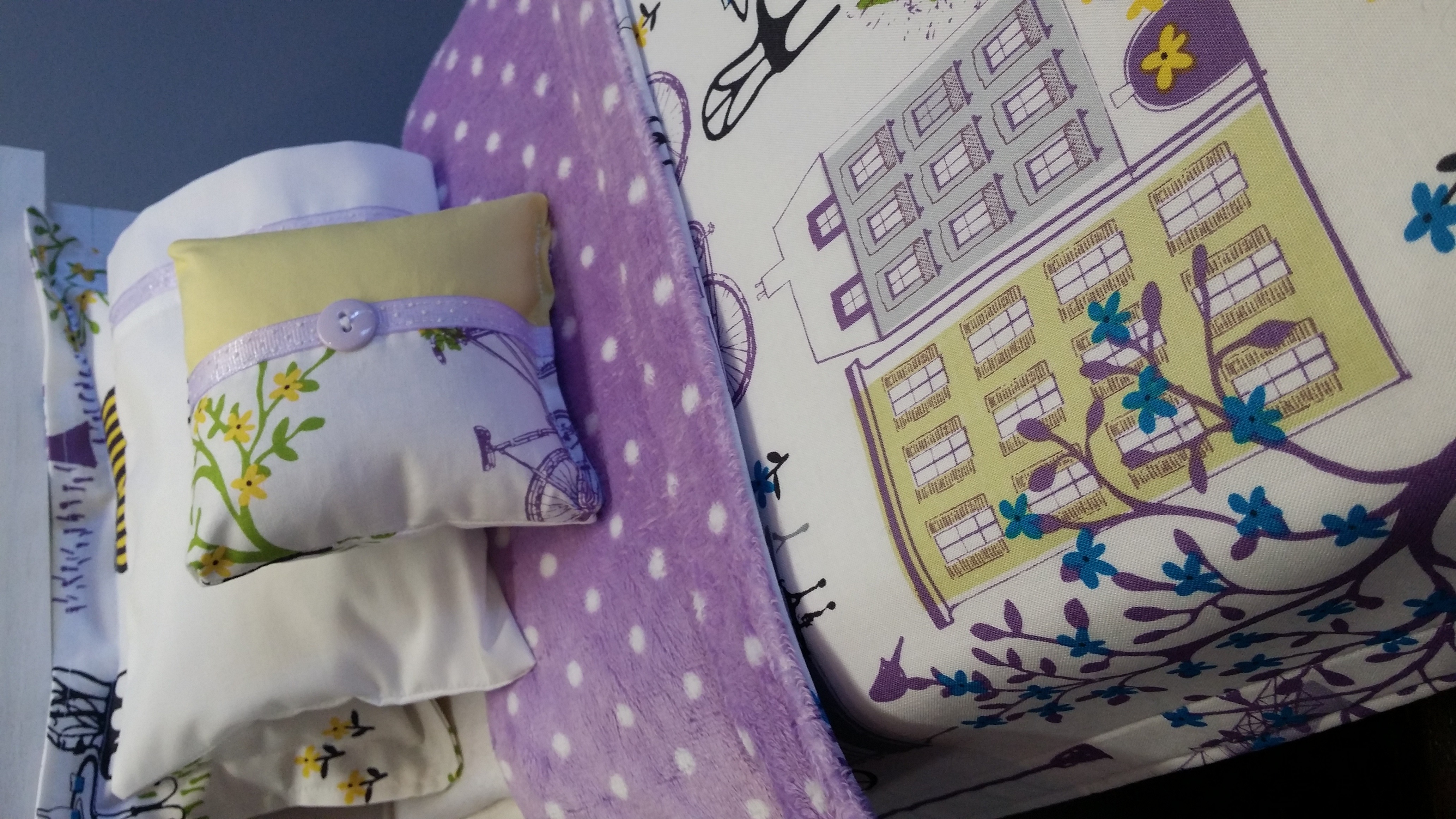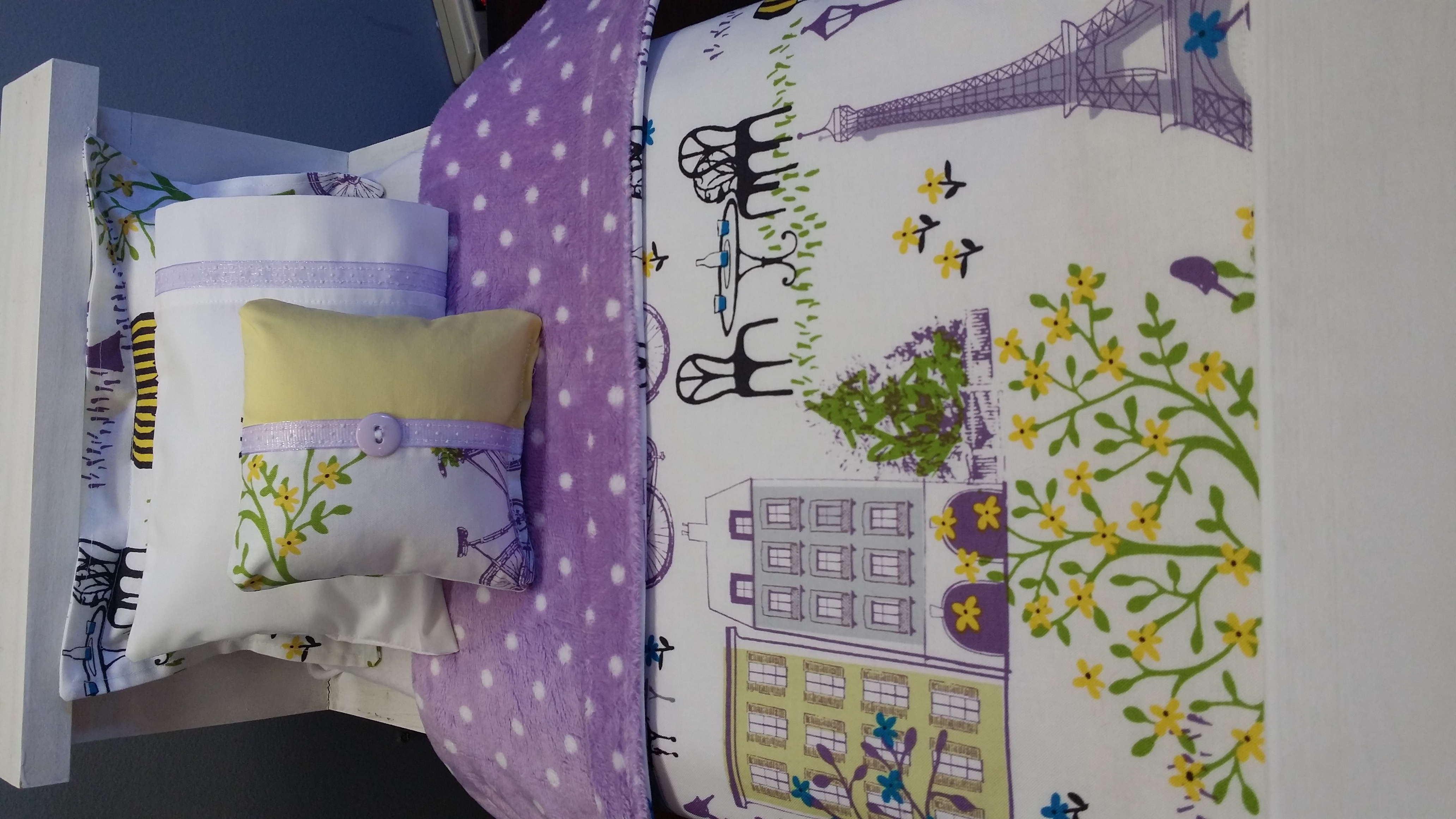 5 piece Paris doll bedding made to fit 18" doll beds. Features a cotton Paris print fabric backed by a purple and white polka dot print fabric.